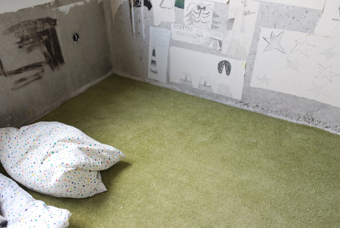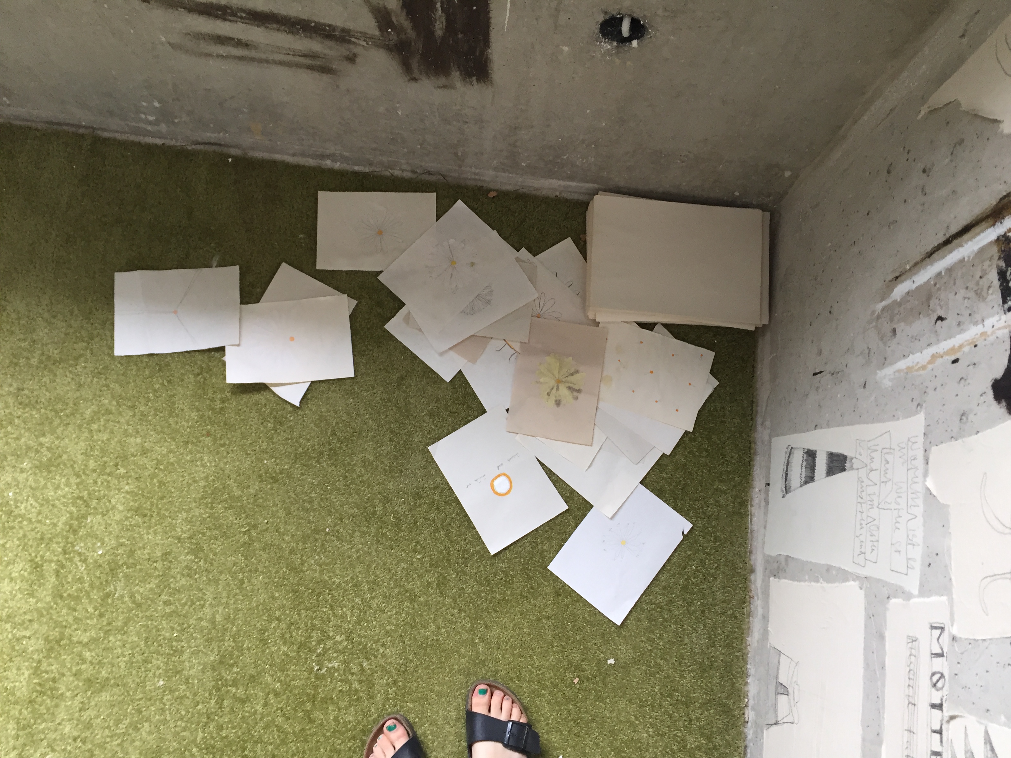 pencildrawings on canvas, dried daisies, wood cube and other found objects, photographs, notebook and bed.